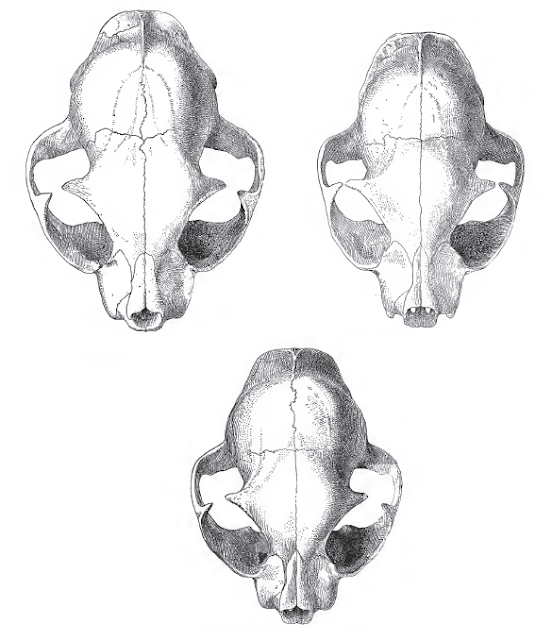 | Skulls of a wildcat (top left), a housecat (top right), and a hybrid between the two. (bottom-center) |