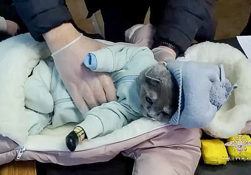 | Screenshot. Young grey cat dressed as baby as a way of hiding drug smuggling. |